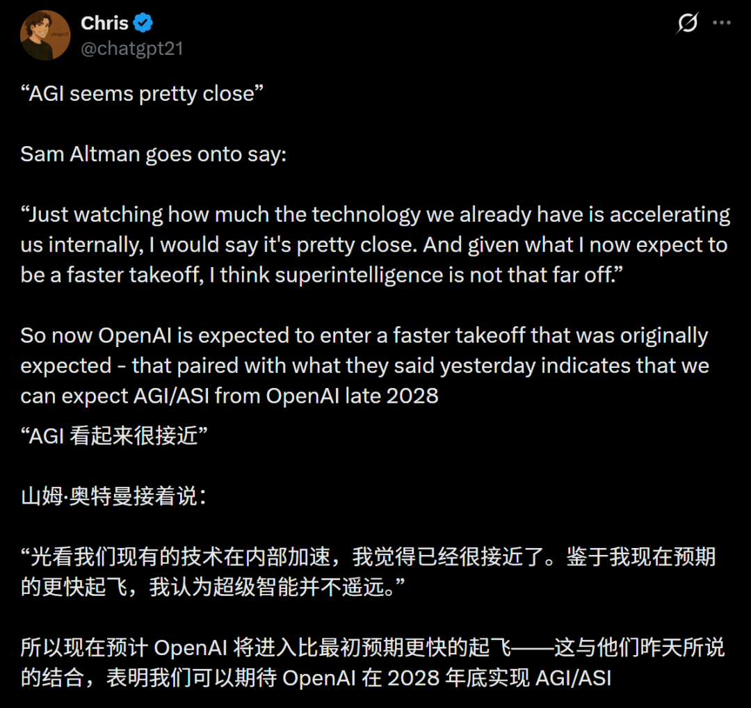 他再次强调:我们可以期待,OpenAI在2028年底实现AGI/ASI。