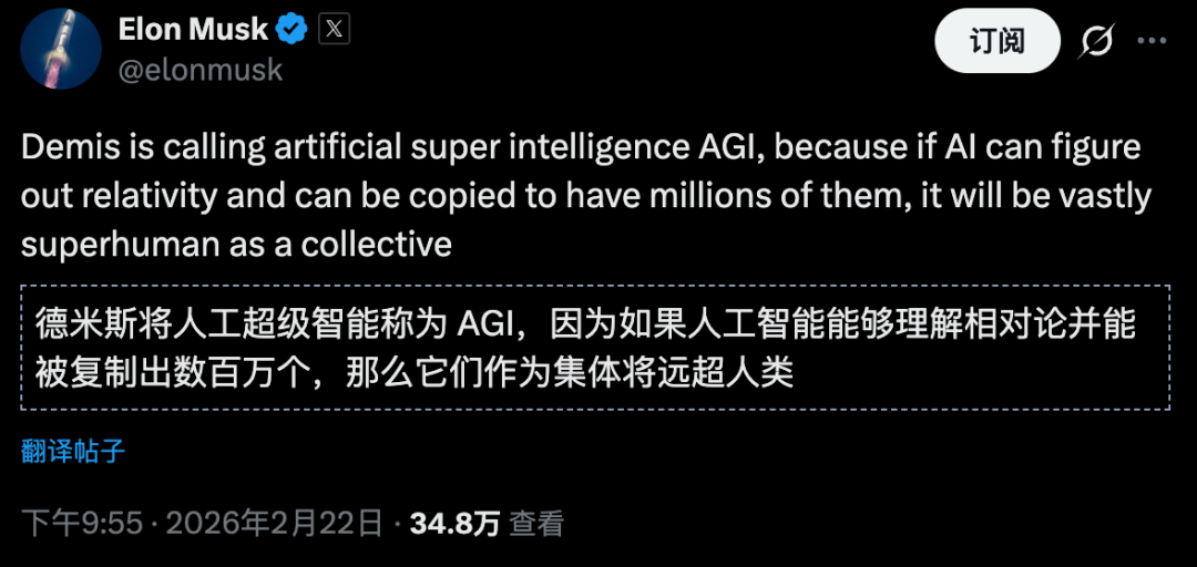 马斯克的意思很明确:你把超级智能的门槛当成了AGI的及格线,这属于标准错位。
