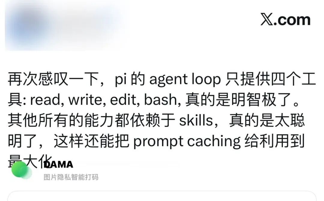 这种最小化工具集的思想启发了我,我们是否不用那么多工具,转而用一些最基本的工具把这些功能组合出来呢?貌似可靠,该做减法了。其实一个智能体会的东西比想象中多,你给它提供 bash,它就能安装世界上所有软件;你给他 file_read 和 file_write,它就有了读写、做事的能力。我们可以去掉一些工具,更多依赖 Skill。在我看来,工具和 Skill 的区别在于工具是框架提供的,而 Skill 仅是文本,前者框架完成就已经固定*,后者 AI 可以自己创建、修改。框架二字顾名思义,是限制 AI 发挥的东西,AI 在里面就像滚筒上的小白鼠,只能按预定的程序运行。我希望框架越小越好,小到只有一个推理核心,作为 AI 的大脑,把更多的自由留给AI,想要什么功能,让AI自己去完成,人只通过prompt 的方式去下达指令。