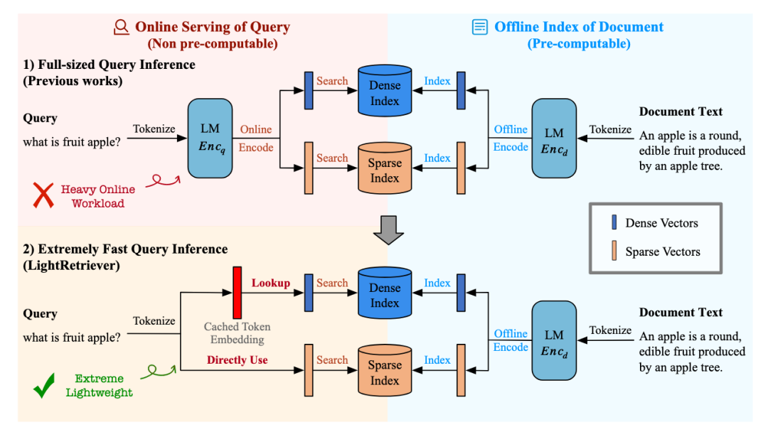 LightRetriever 的核心思想非常明确:将深度建模的主要计算负担彻底转移到 Doc 侧,而在 Query 侧只保留必要、可缓存的表征能力。LightRetriever 为稠密和稀疏检索两大检索范式,分别设计了极致非对称的建模方法。