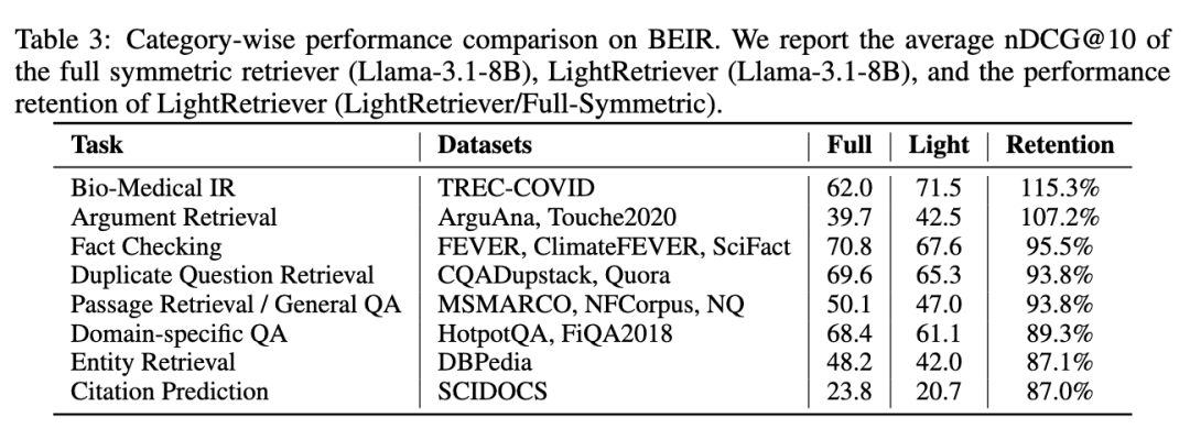 表:LightRetriever 在 BeIR 的不同任务中的性能表现及相对变化(Retention)