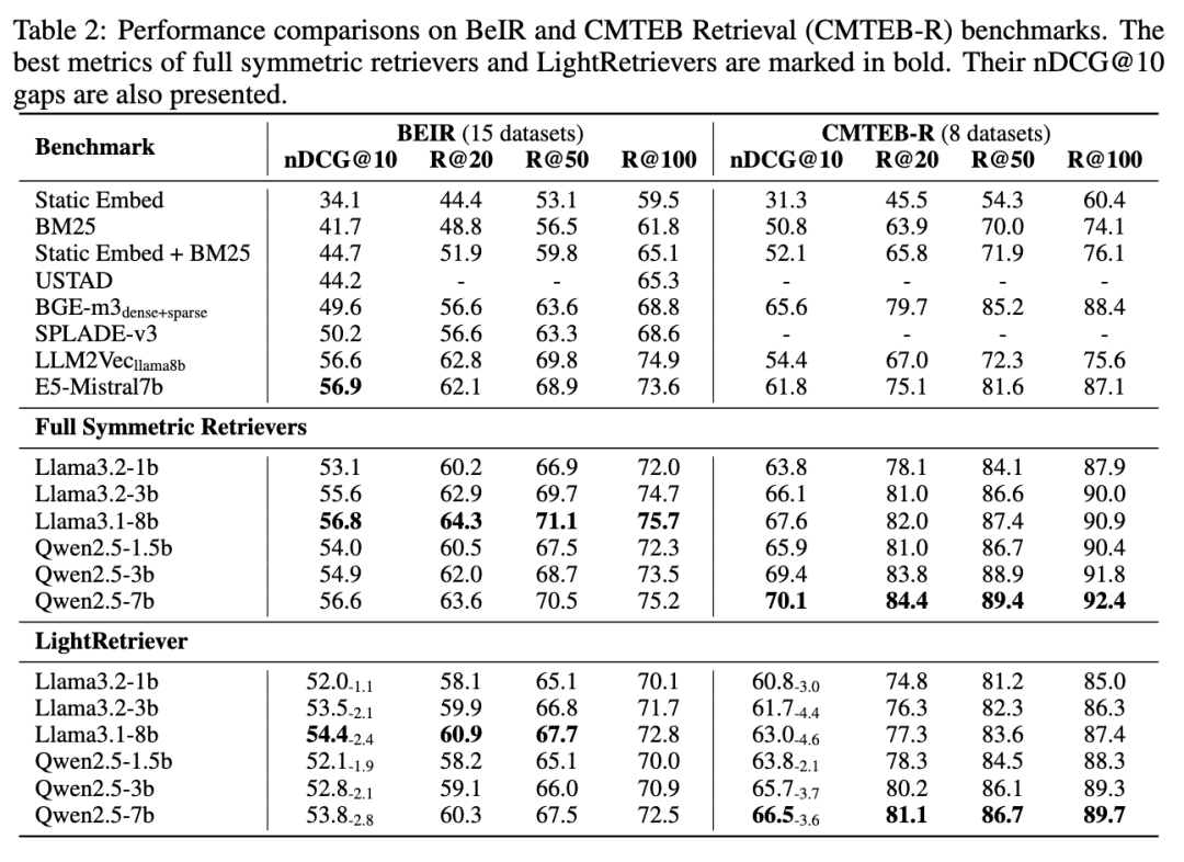 表:BeIR / CMTEB-R 主实验结果,包含经典 Embedding Model Baseline、对称式 Full LLM Retriever 与 LightRetriever 的检索效果。