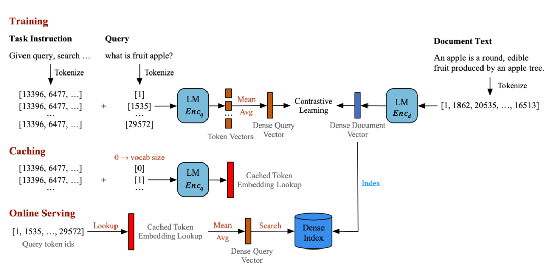 不同之处在于,这些 Token Embedding 在训练完成后,被整体缓存为一个词表级 Embedding 矩阵。在线推理时,查询句向量的推理仅需一次简单的 Token Embedding 查表 + 求均值,不再涉及任何 LLM 推理。因此,Query 侧稠密向量训练遵循“训练全量 + 推理轻量”的思想,后面的消融实验证明,训练全量不可忽略。