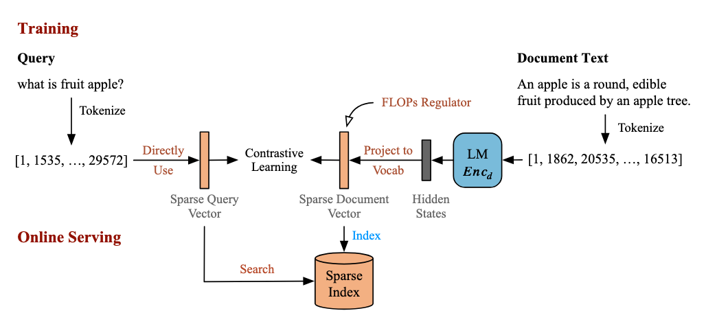 同样通过端到端对比学习,通过 Doc 侧的 LLM,学习与 SPLADE 方法类似的稀疏向量。