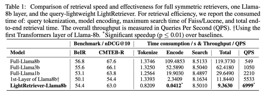 在 MSMARCO 场景下,对 64k 查询进行检索时,完整的 Llama-8B 查询编码需要超过 100 秒;而 LightRetriever 的查询编码时间仅为 0.04 秒,对应超过1000× 的编码加速。即便考虑 Faiss 与 Lucene 的检索时间,端到端吞吐仍然获得了 10× 以上的 QPS 提升。文章还尝试在 Query 侧只用 Llama-8b 的第一层 Transformers Layer 用于训练和推理,作为经典的 Layer 裁剪的 Baseline。然而,这个设置的检索性能和 QPS 均不如 LightRetriever,证明文章中“训练全量 + 推理轻量”的设计仍为合理。
