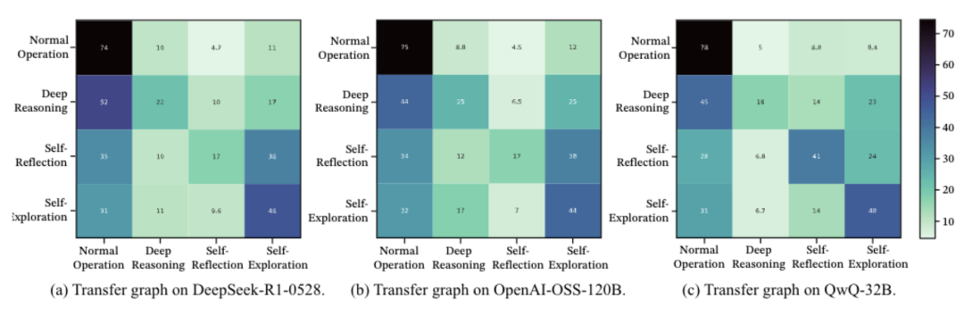 研究发现,所有强推理模型的三种思维行为比例和转换规律都高度一致,相关性超过0.9,说明有效长链推理存在通用的稳定拓扑结构。