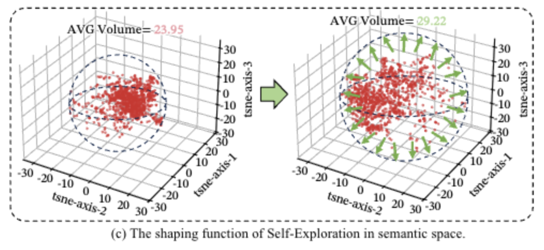 量化分析显示,加上探索行为之后,模型在语义空间里的思维覆盖范围能从23.95扩大到29.22。
