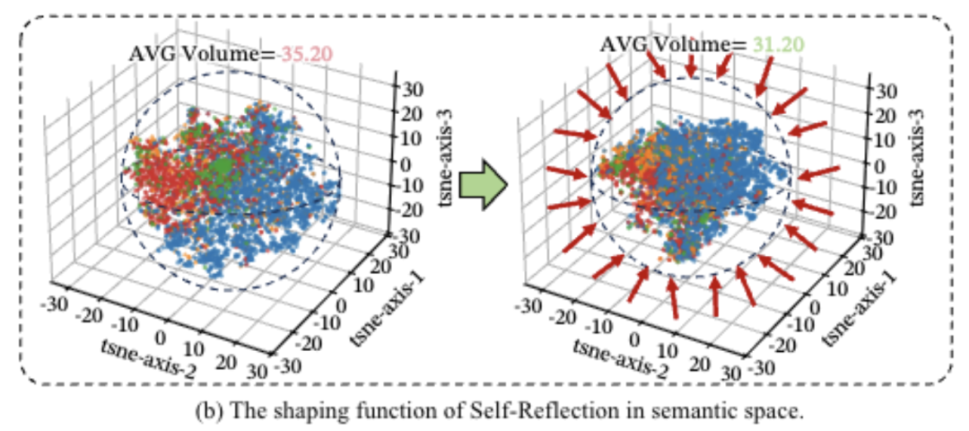 还对比了反思前后的思维范围,反思前,语义空间体积是35.2,反思后,直接压缩到31.2。