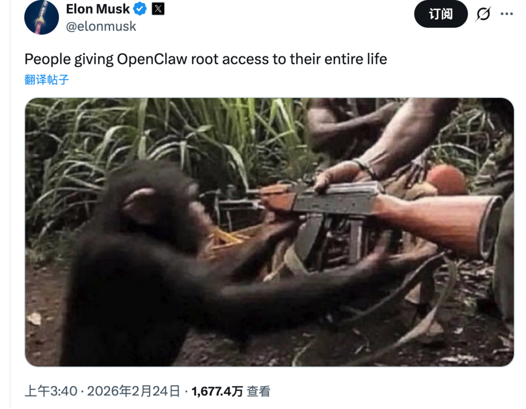 他专门发文并配上了一张《猩球崛起》的截图,无情吐槽道:大家把系统的最高权限交给OpenClaw,简直就等同于把整个人生都交了出去。