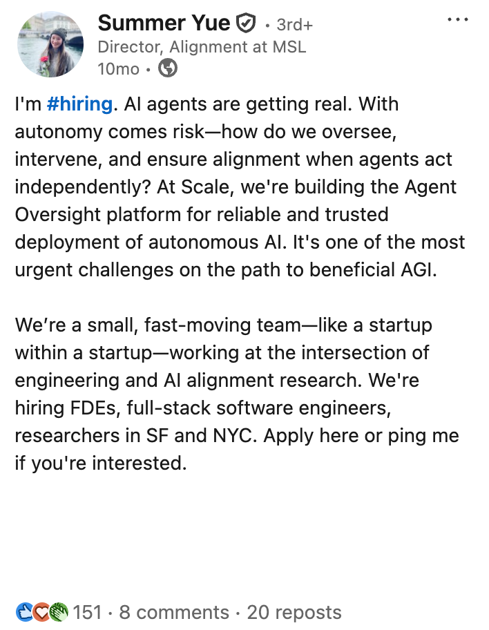 还有人翻出Yue的LinkedIn,截图发推:「这位是Meta AI安全和对齐总监。这应该让你感到恐惧。」