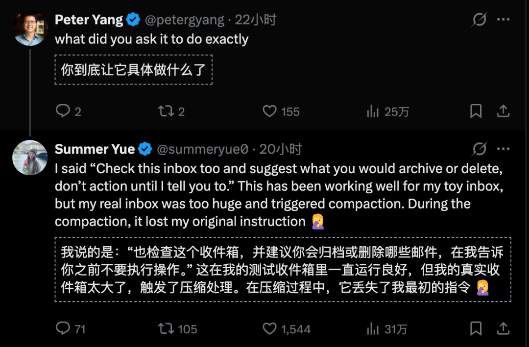 在压缩的过程中,OpenClaw把Yue之前设定的「未经批准不得操作」这条指令,给忘了。