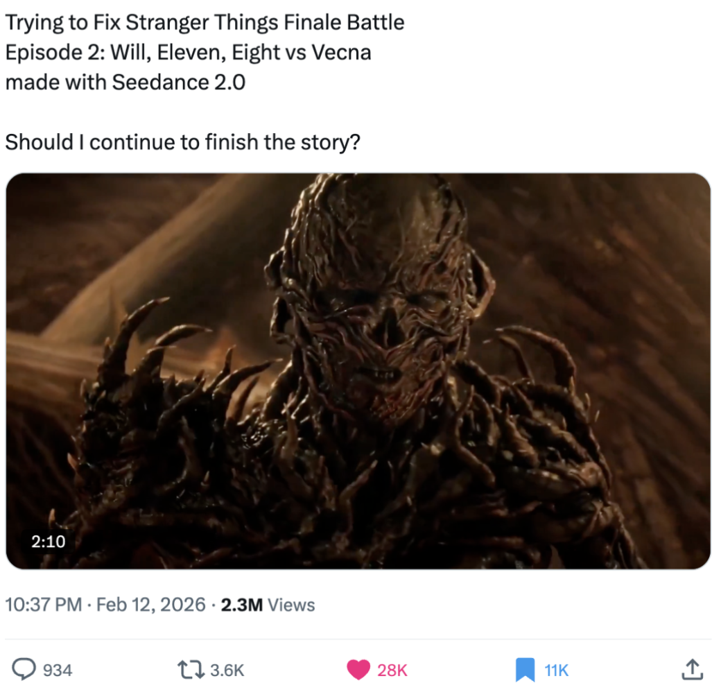 Seedance 2.0 刚好在那个时间点发布,我刚好是最早知道的一批人,《怪奇物语》刚好是全球热度最高的 IP 之一,刚好粉丝对结局不满意……这些条件凑在一起,换一个时间点发,可能就没这个效果。