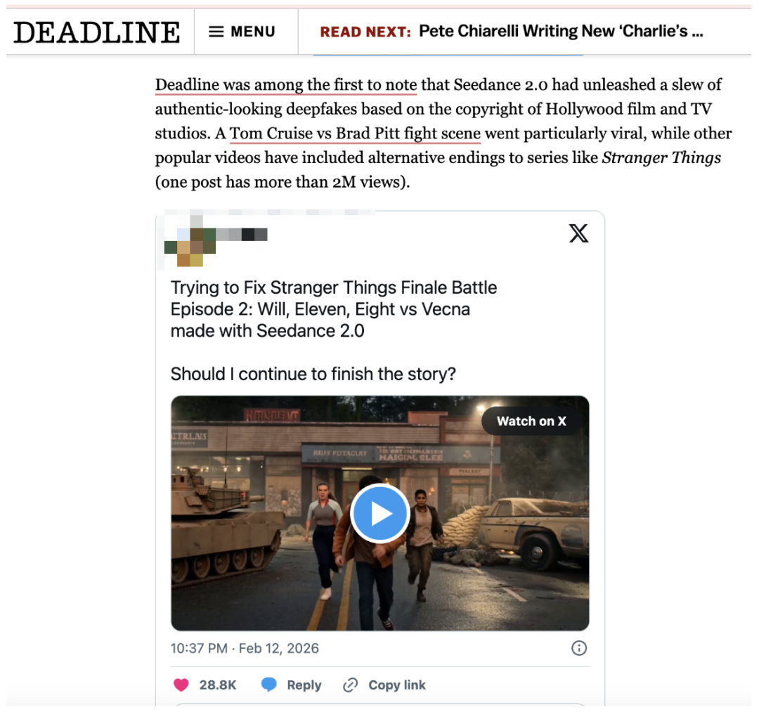 最离谱的是行业内的人也来了。 SAG-AFTRA(美国演员工会)甚至因为这波 AI 视频浪潮专门发了声明。Deadline 写了专题报道,Cosmic Book News 也做了报道,都点名提到了我的《怪奇物语》视频。