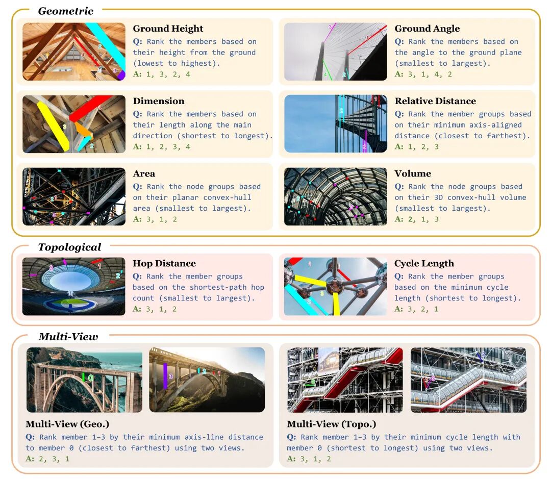 SSI-Bench正是在这一背景下提出:它不再将模型置于约束较弱、可自由组合的日常场景中,而是面向复杂真实工程结构构建评测环境,要求模型形成约束一致的三维结构假设,并在此基础上完成空间推理。