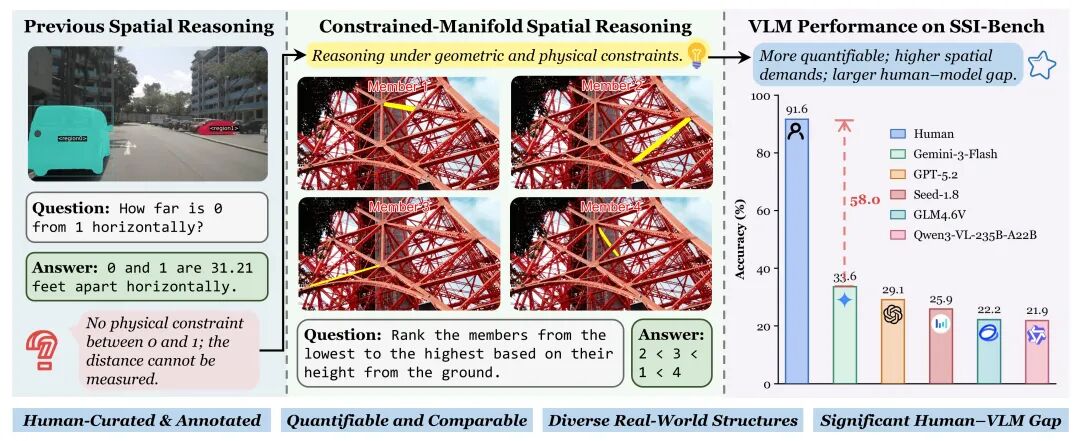 为此,清华大学的研究团队推出SSI-Bench,从AI与结构工程的交叉视角出发,为空间智能评估提供了一种新的场景化思路——将评测置于复杂三维结构的约束流形中,系统检验多模态大模型的空间智能表现。