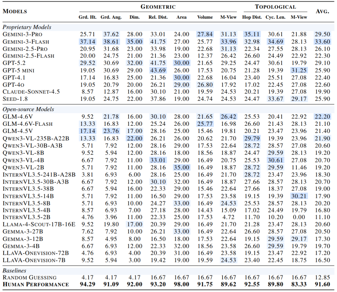 人类平均91.6%,最强闭源33.6%(Gemini-3-Flash),最强开源22.2%(GLM-4.6V),随机猜测基线12.85%