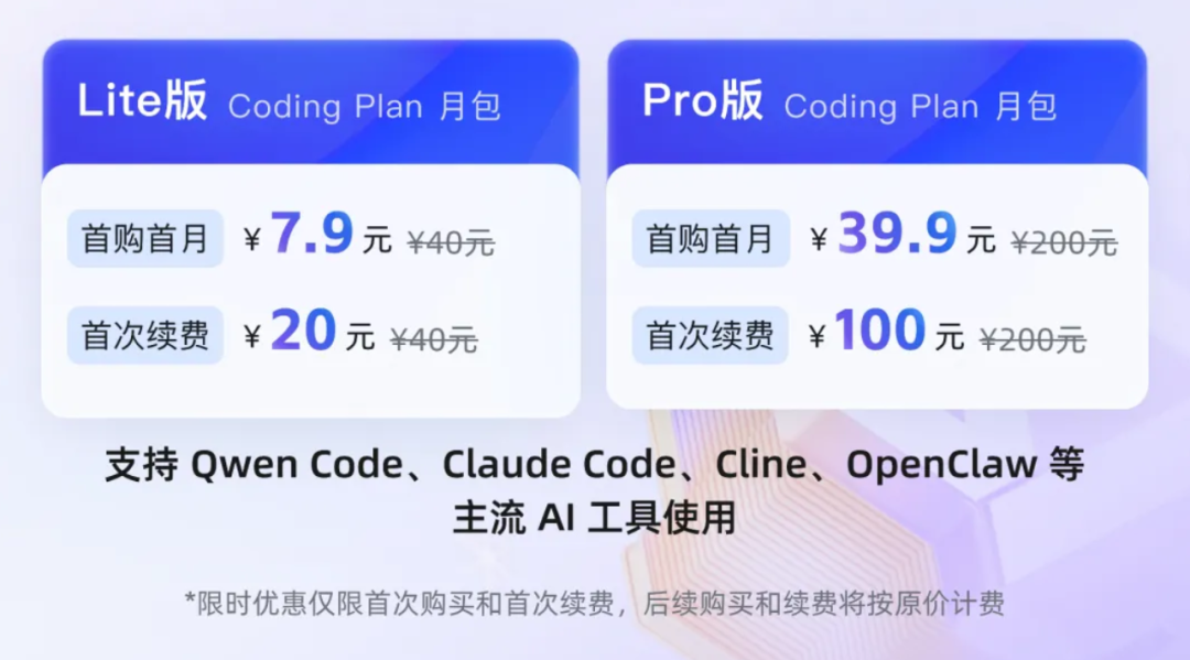 Token量大管饱,新用户低至首月7.9元,即可在Qwen Code、Claude Code、Cline,以及最近大火的OpenClaw等工具间无缝切换顶级模型。