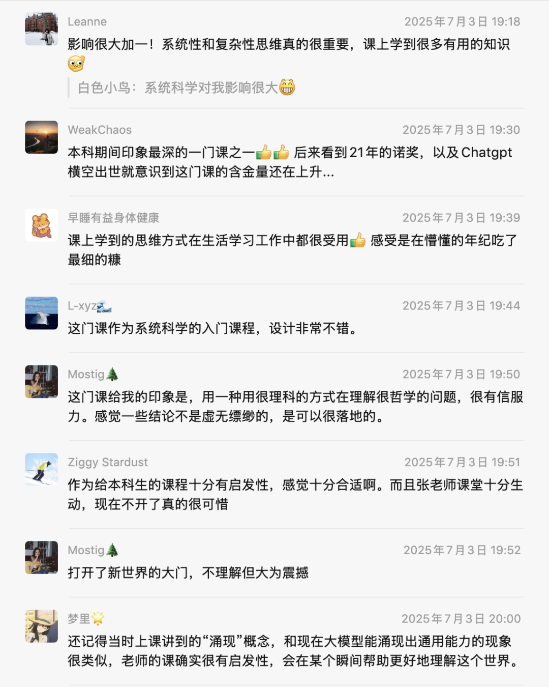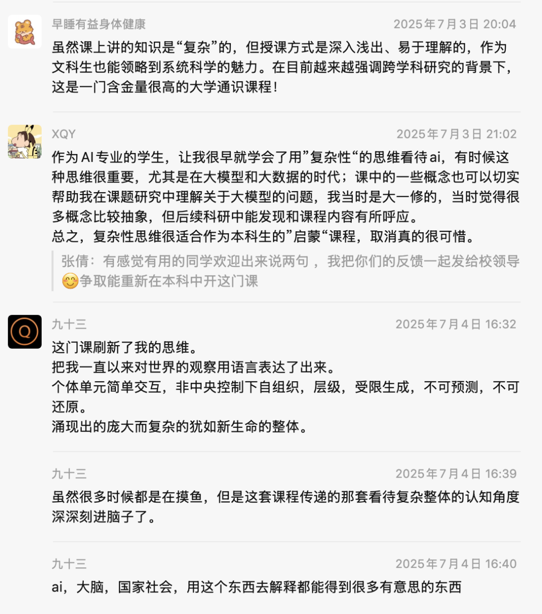 选修张江老师课程,即赠送集智学园VIP会员,海量前沿课程免费学!表现优异者还可加入字幕组兼职,边学习边赚零花!学分好拿,考试好过! 平时讨论+项目汇报/开卷考试,轻松修学分,收获硬本领!名额有限,先到先得! 无论你是理工科本硕博,还是渴望跨界思维的文科生,这里都有属于你的未来赛道!张江讲的好不好?听听历届学长学姐们毕业八年后的真实评价吧!