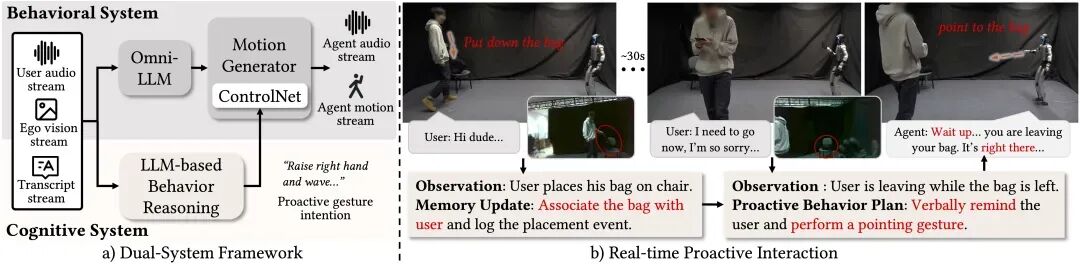其中,行为系统(Behavioral System)作为「快系统」,负责维持高频、低延迟的多模态交互流;认知系统(Cognitive System)作为「慢系统」,配备记忆与推理模块,负责长程推理并生成高层主动意图。