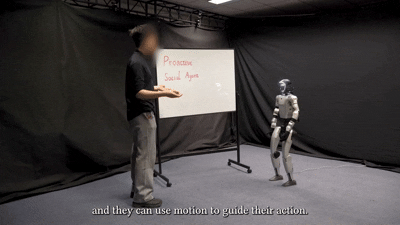 此外,模型还能同时接收双方的语音流进行双人交互建模,这让机器人不仅在说话时有手势,在倾听时也能有自然的身体晃动等反馈。