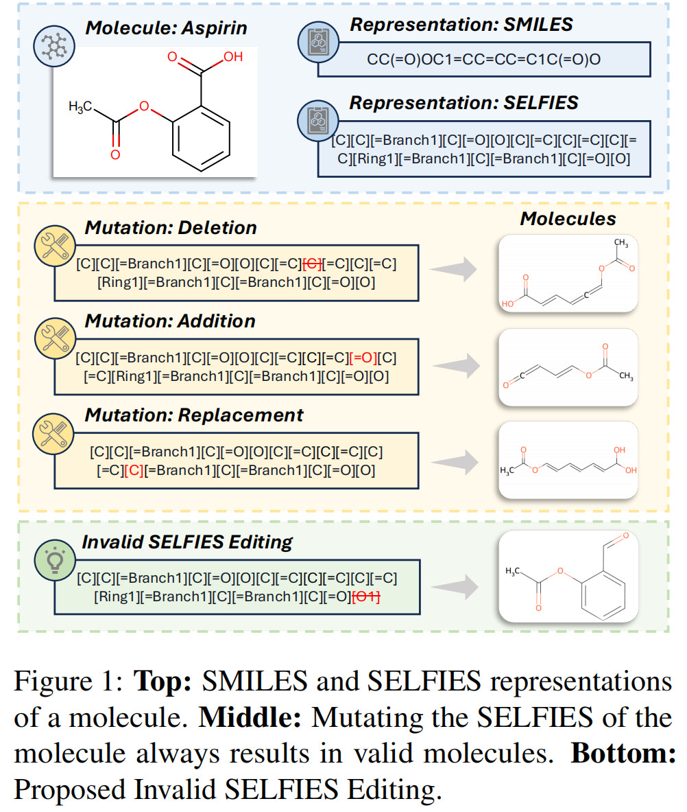 SELFIES的设计保证了其字母表里任意符号组合都对应一个合法分子,即便随机删除、添加或替换SELFIES字符中的符号,其对应的分子仍然有效。研究团队据此提出了“无效SELFIES编辑”方案:直接让LLM生成SELFIES,再过滤掉其非字母表符号。