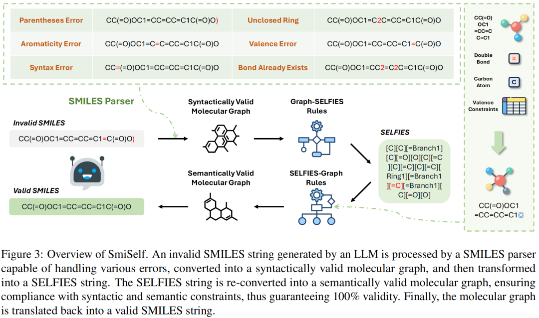 通过这一流程,SmiSelf同时消除了原始SMILES中的语法错误和语义错误,从而保证100%有效性。