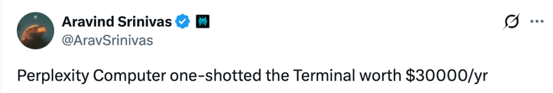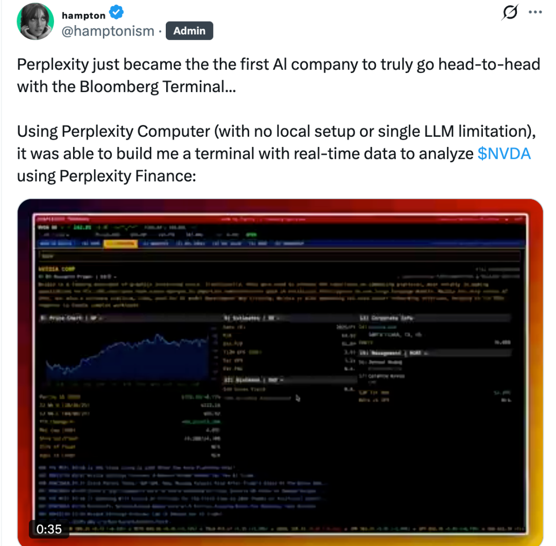 发布后仅5个小时,就有网友用Perplexity Computer手搓了一个平民版彭博终端机(Bloomberg Terminal)。
