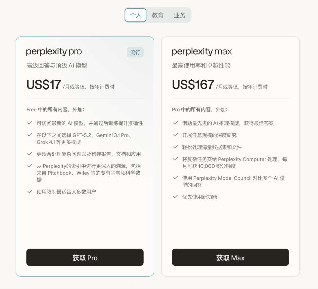 Perplexity Computer目前只对Max订阅用户开放,Max用户每月可获得10,000积分。