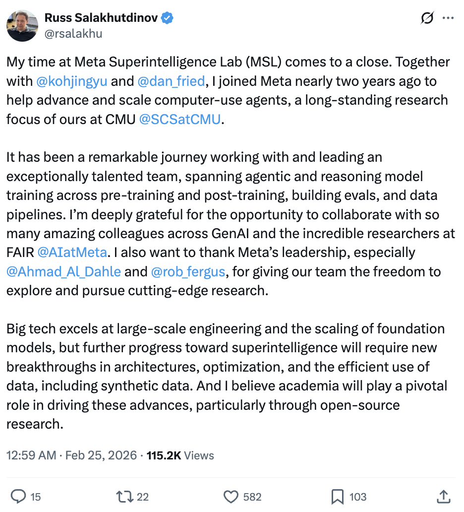 Geoffrey Hinton核心弟子、Meta生成式人工智能研究副总裁、卡内基梅隆大学计算机科学教授、苹果首任AI总监Russ Salakhutdinov,在Meta任职已满两年,就在昨天也官宣离职了。