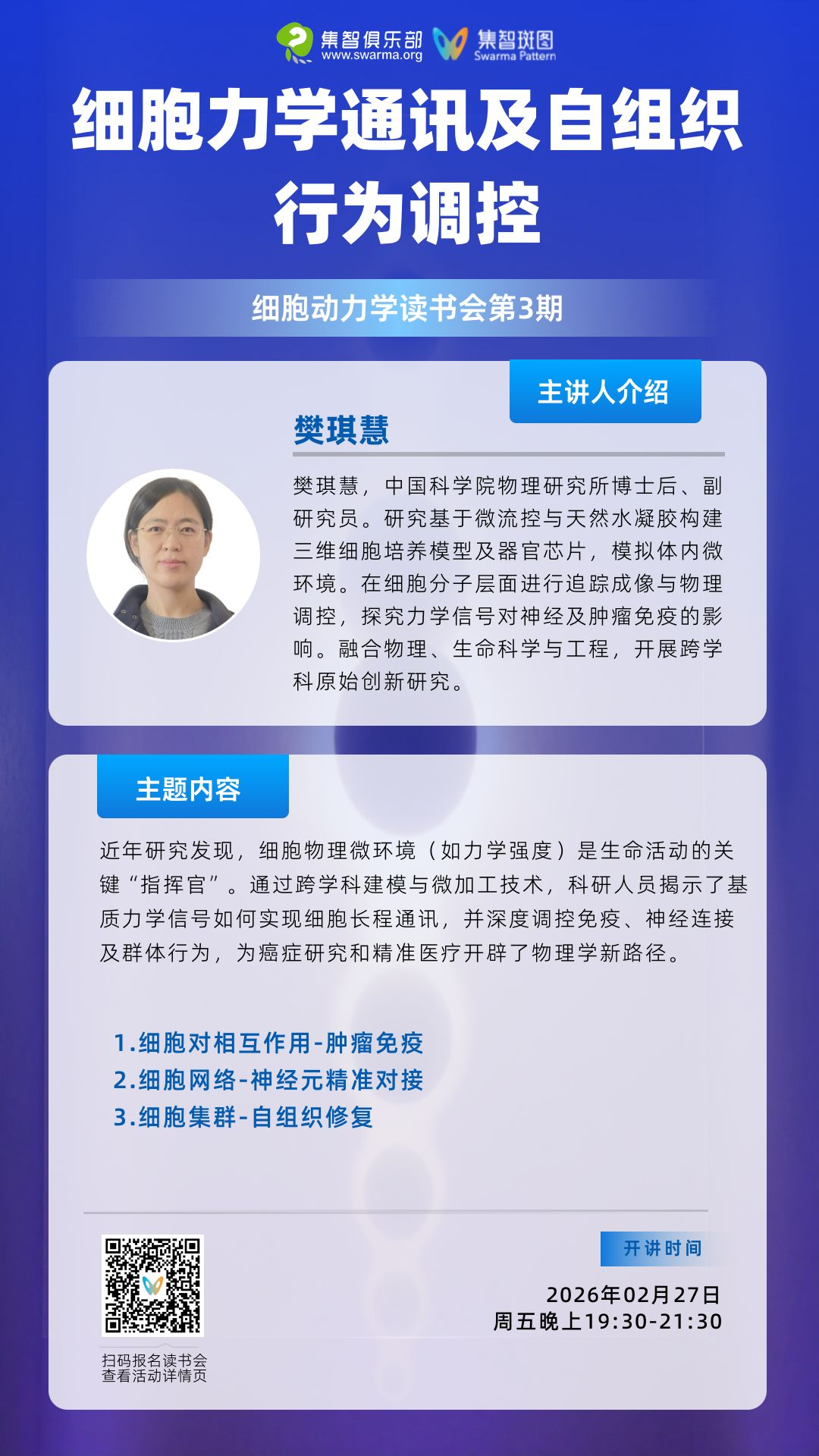 2026年2月27日(周五)晚19:30-21:30,腾讯会议线上进行,微信视频号+集智俱乐部B站号同步直播,感兴趣的朋友扫码报名加入细胞动力学读书会后,可进入学员群进行交流。
