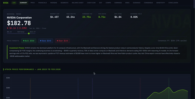 下面演示中,它可以针对英伟达股票进行深度分析,包括股价图表、公司信息、财务摘要和市场洞察。