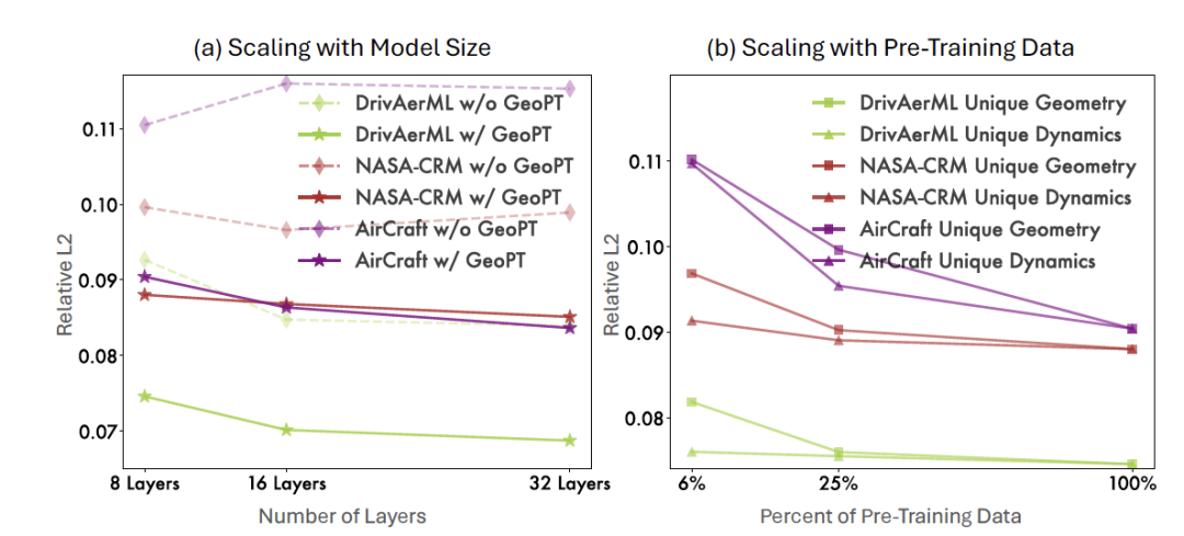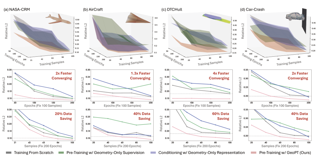 实验结果表明,GeoPT显著降低了对标注数据的依赖,在达到相同精度时可节省20-60%的物理仿真数据。