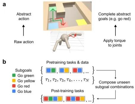 此外,元控制器还能动态时间整合,它能通过开关单元控制抽象每一步动作的持续时间。并且能组合泛化,将学到的抽象动作重新组合解决新任务。