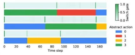 经由强化学习,研究者发现元控制器能够通过变分推理自动识别有意义的行为模块,这相当于无监督发现抽象动作该怎么完成。