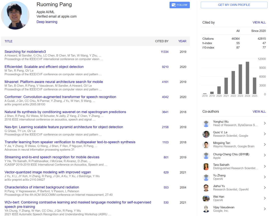庞若鸣的个人Google Scholar中,发表了多达100多篇有影响力的研究,个人被引数超46000。