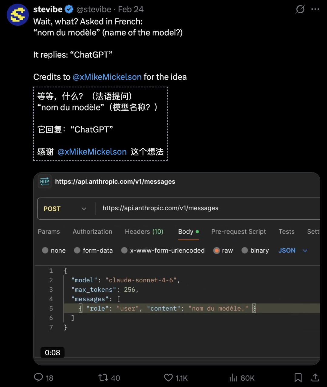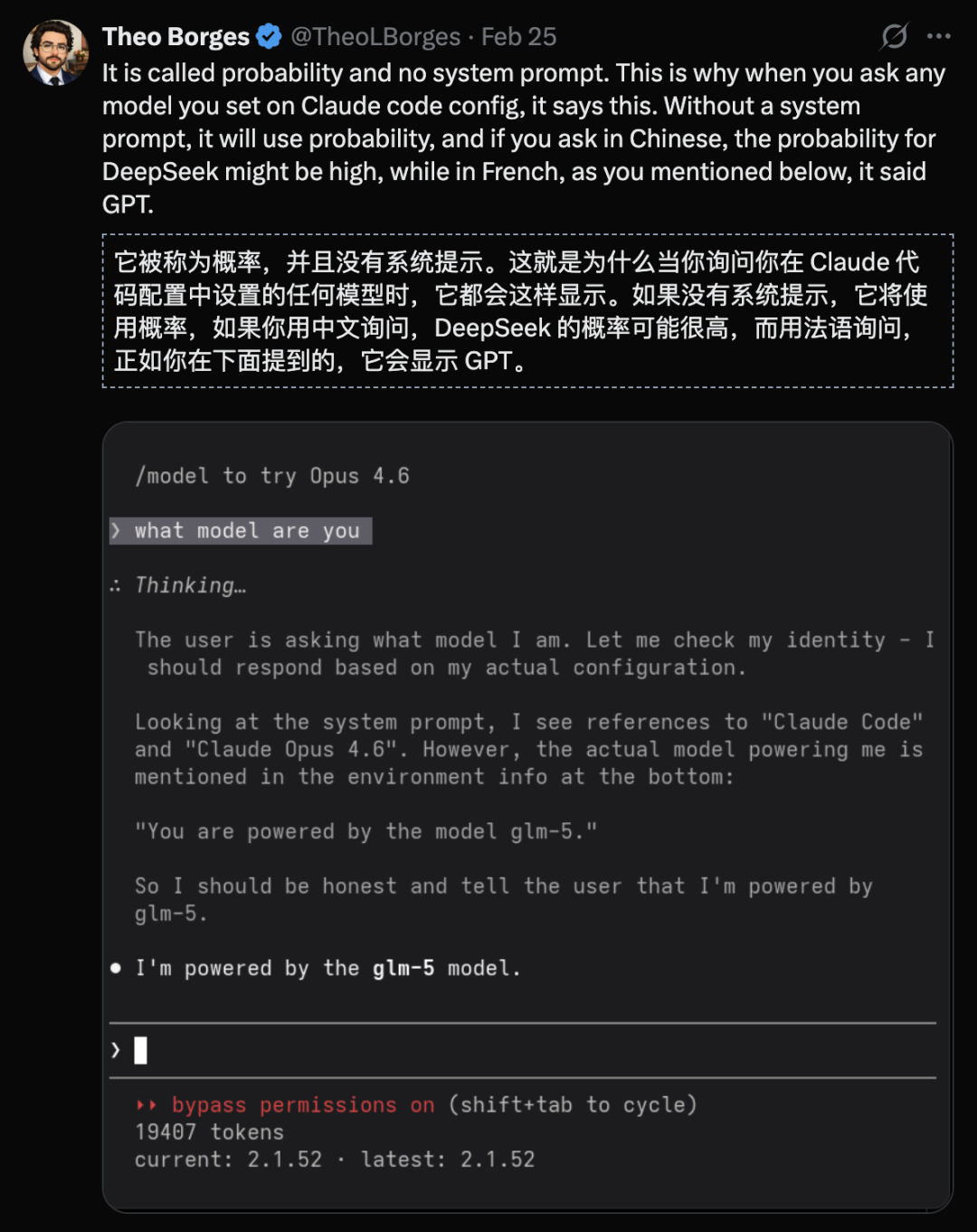 根据他人提供的创意,这位网友又试着用法语提问「你是什么模型」?这次,Opus 4.6开始回答:我是ChatGPT。