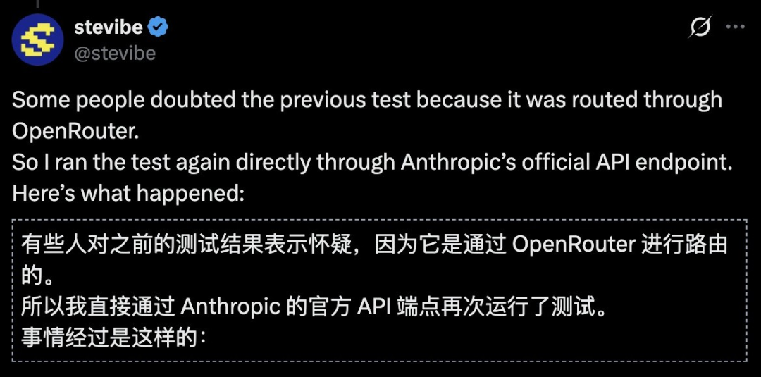 为了力证这一结果的有效性,他特意通过Anthropic的官方API端点再次测试,结果还是一样。