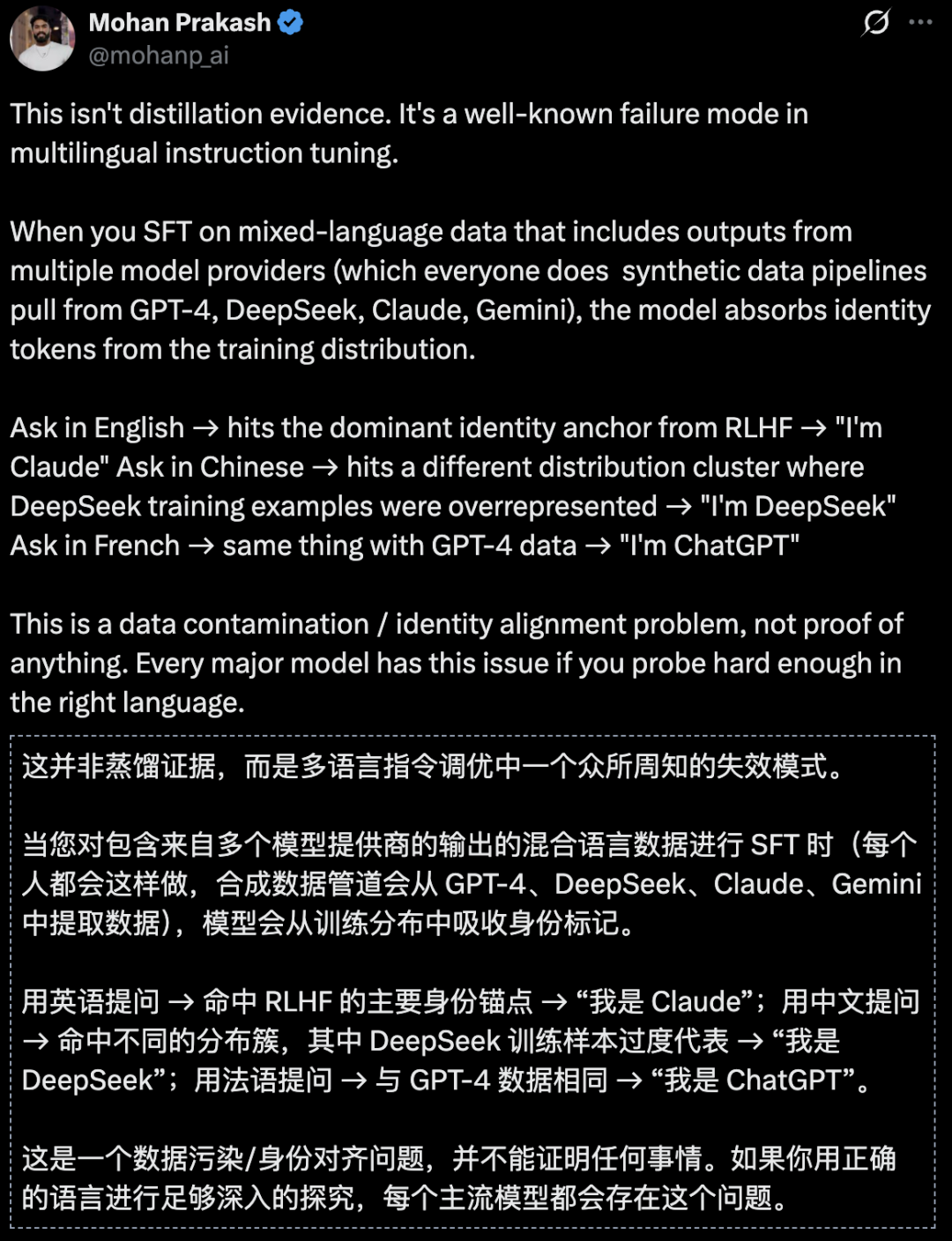 这不一定说明「蒸馏发生了」,但它说明——模型的语言空间是共享的。当整个行业都在同一个语料海洋中训练、优化、蒸馏时,边界本身就变得模糊。