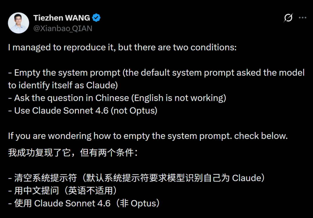 当然,Claude Sonnet 4.6会自称「我是DeepSeek」,需要符合以下三个特定条件——清空系统提示、使用中文提问、特定模型版本。