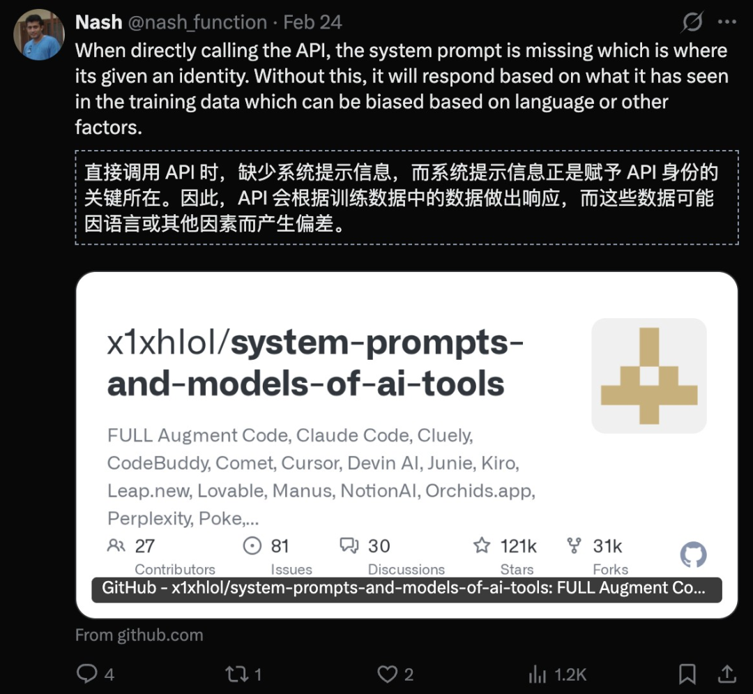最大的原因可能是系统提示词。如果没有系统提示词,AI会根据训练数据回答。