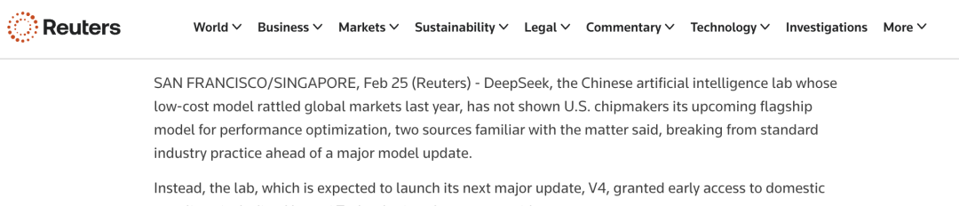 路透社称,一些芯片厂商已经接入DeepSeek V4,优化性能。