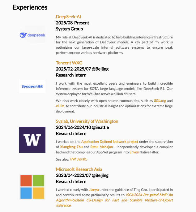 他目前在DeepSeek系统组,参与下一代模型的推理基础设施建设,负责大规模软件系统在多硬件平台上的性能优化。