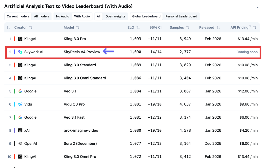 来自昆仑天工的SkyReels-V4,直接干到了文转视频(含音频)全球榜第2,位列Veo 3.1、Sora 2之前。