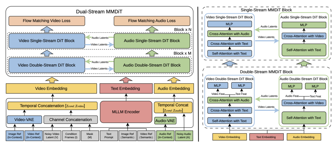 它采用双流MMDiT架构,把音、视频从底层就焊在了一起。