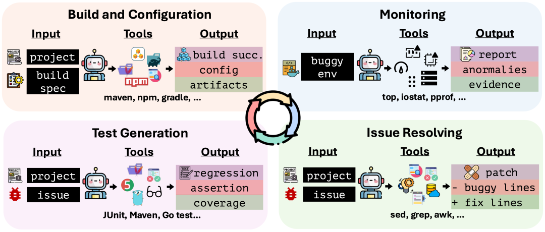 在真实世界中,一个代码变更的生命周期是漫长而痛苦的: 你需要搞定复杂的构建环境(Build & Config); 你需要将代码部署上线,并盯着仪表盘监控它是否导致了内存泄漏(Monitoring); 当警报响起,你需要从日志中定位问题并修复(Issue Resolving); 最后,你还得补上回归测试,确保问题不再复发(Test Generation)。