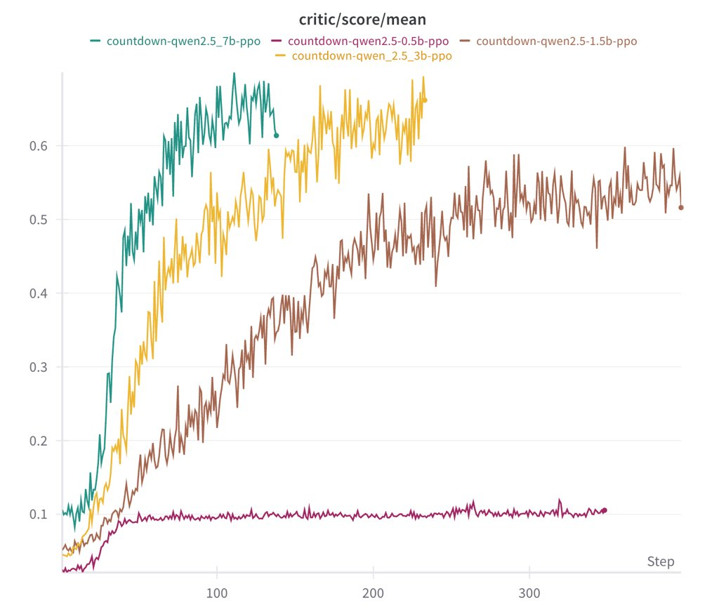 Countdown任务中不同参数规模模型的PPO训练critic score曲线。可以看到,即使是3B的小模型,经过强化学习训练后也能展现出明显的能力提升。