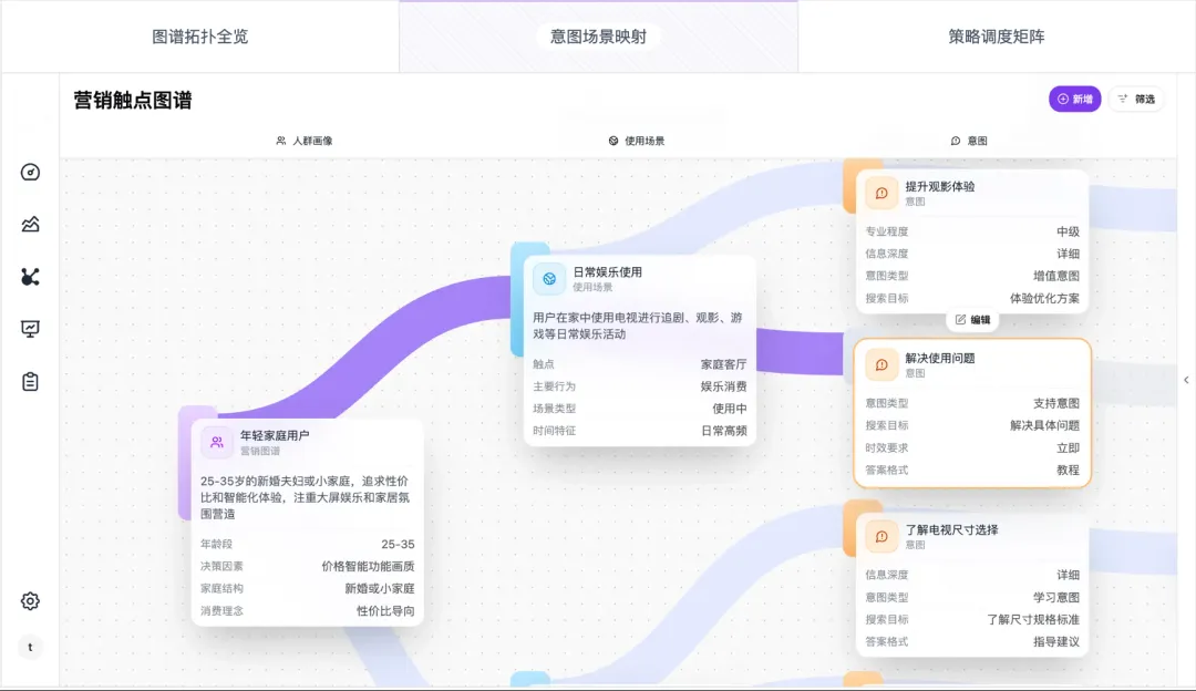 AI 依靠 Prompt 来理解用户意图。为了让 AI 听懂企业的故事,我们提出了「营销图谱」的概念。最早的一版设计非常复杂,包含了地点、画像、触点等七八个层级。后来在和早期创始人沟通时,我发现解释起来太累赘,大家真正关心的其实还是那三个老问题:谁?在什么场景?为什么需要?