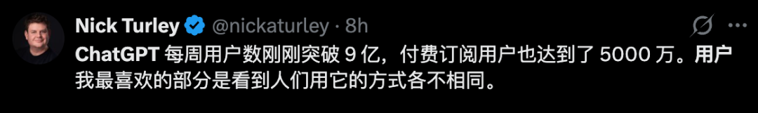 不仅如此,自今年年初以来,ChatGPT周活跃用户超过9亿,订阅人数超5000万,付费企业用户超900万。