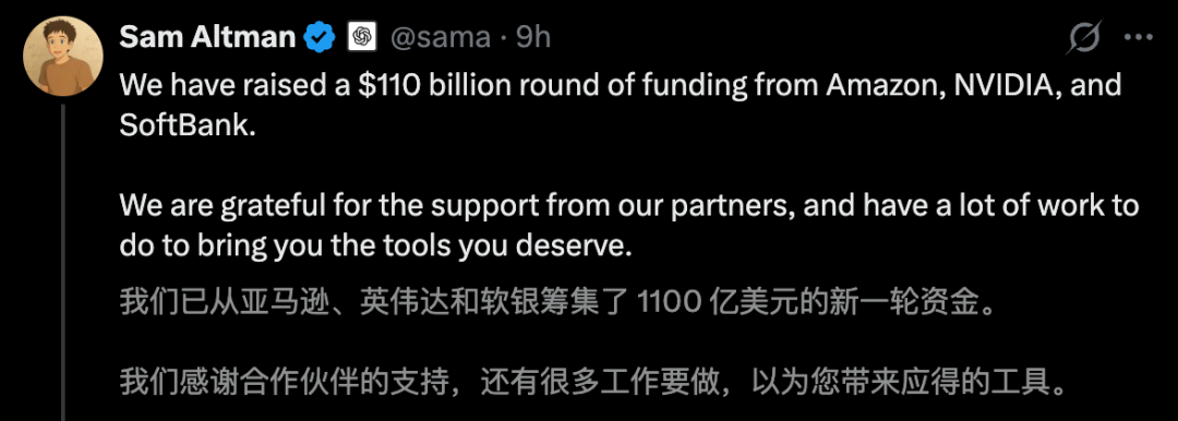 就在今天,奥特曼官宣:OpenAI从英伟达、软银和亚马逊手中,拿下了1100亿美元融资。