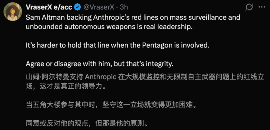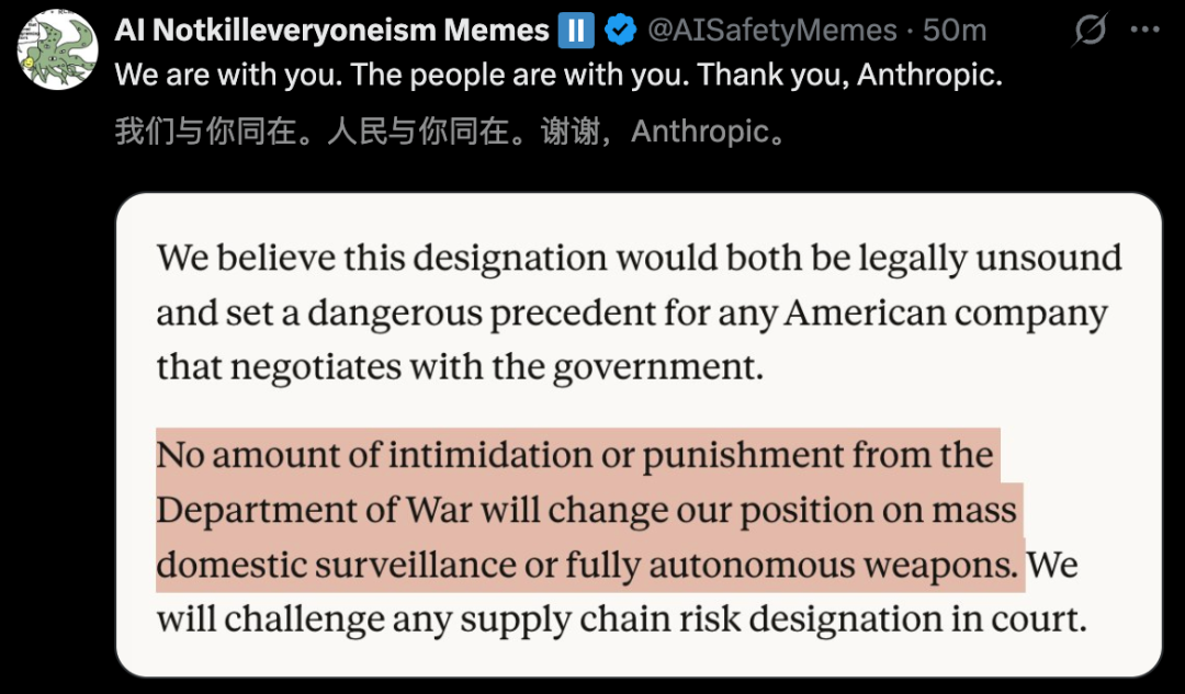 请继续顶住压力,坚决拒绝战争部目前提出的无理要求——即索要权限,将我们的模型用于国内大规模监控,或在缺乏人工监管的情况下自主剥夺生命。